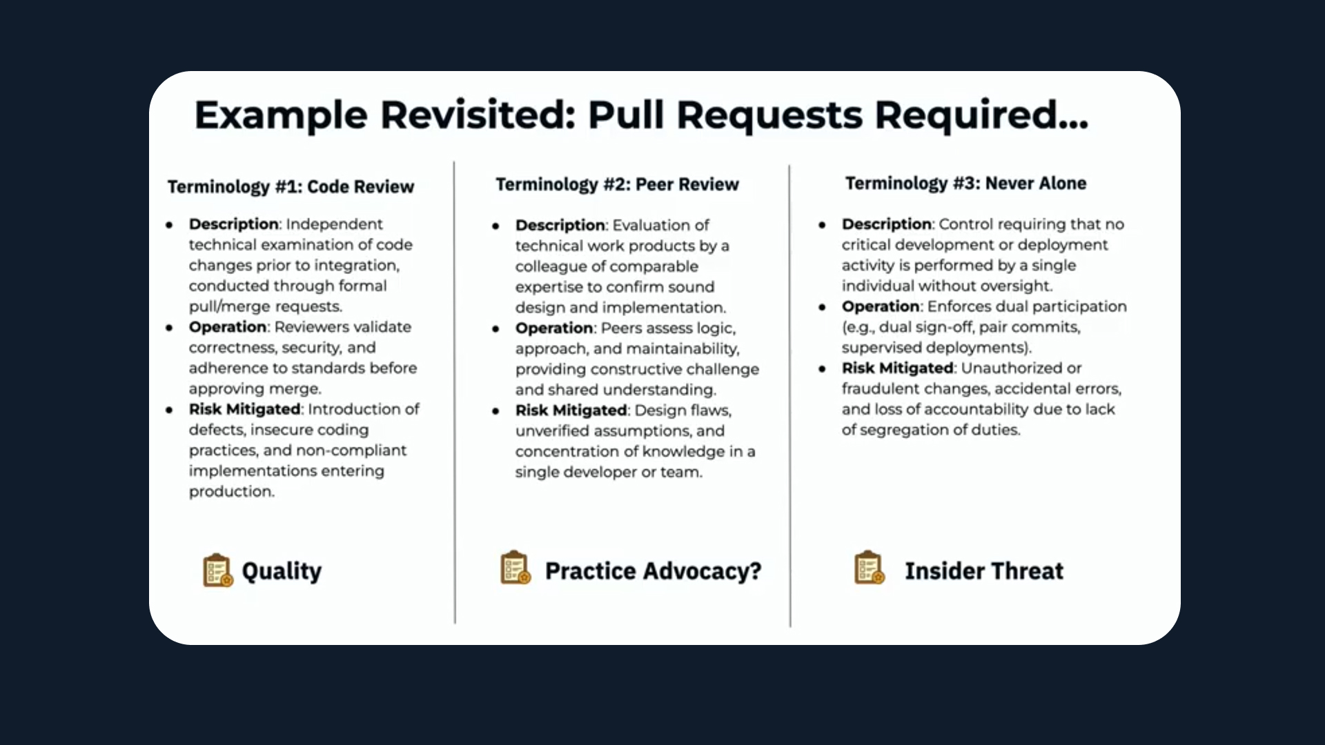 All of those perspectives are valid — but they’re not aligned. Even the terminology is inconsistent. Code review, peer review, never alone — all describe overlapping but distinct ideas.