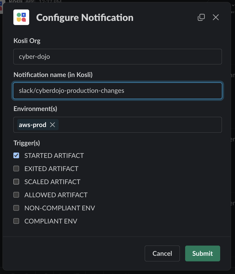 This is how you could set up deployment notifications for an environment monitored in Kosli: